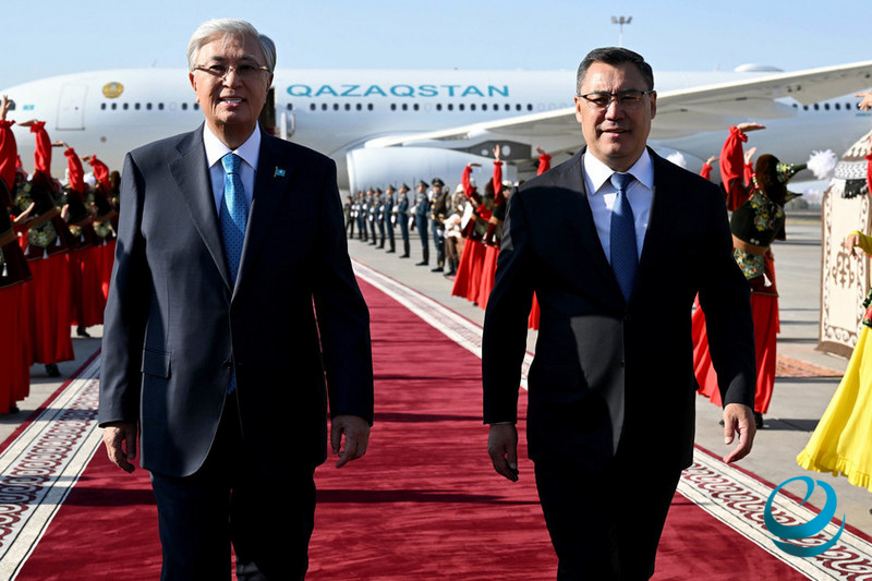 Казакстан лидеринин кортежи “Ынтымак Ордо” имаратына келип, Касым-Жомарт Токаевди президент Садыр Жапаров тосуп алды. Президенттик администрациянын имаратынын алдындагы флагштокторго Кыргызстан менен Казакстандын мамлекеттик желектери илинип, ардак кароол тизилди.