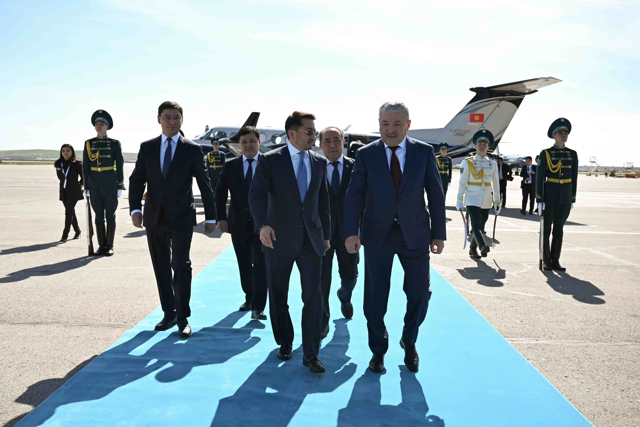 Адылбек Касымалиевди Казакстандын премьер-министринин орун басары — жасалма интеллект жана санариптик өнүктүрүү министри Жаслан Мадиев жана башка расмий адамдар тосуп алышты.